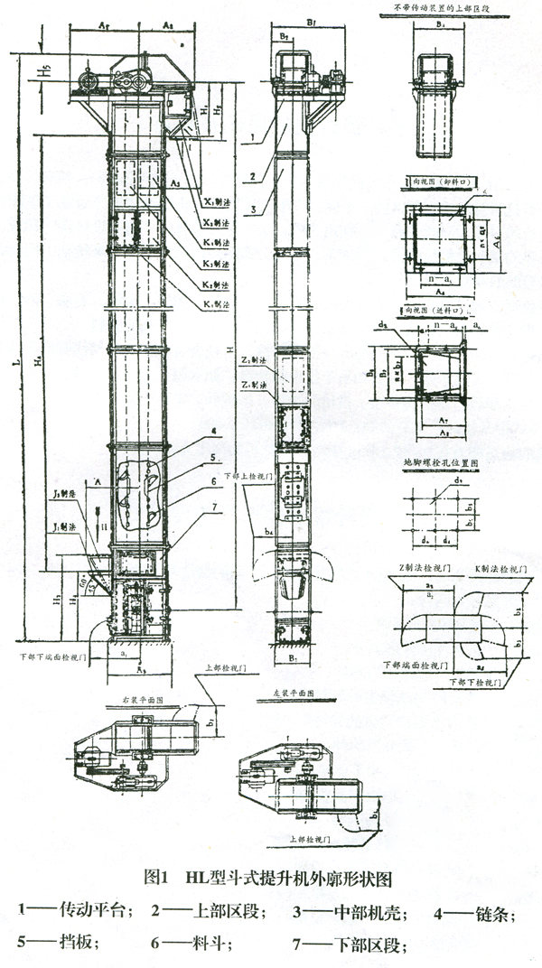針對(duì)不同的使用要求,HL型斗式提升機(jī)具有不同的制法和裝法: