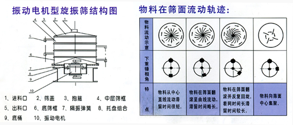 S49振動電機旋振篩是通過立式振動電機直接傳動,使篩體產(chǎn)生復旋型振動,此振動軌跡為—復雜的空間立體曲線,從而使篩體產(chǎn)生篩分作用。調(diào)節(jié)上下重錘的空間相位角,可以改變物料在篩面上的運動軌跡。